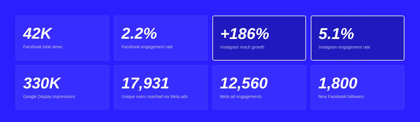 A 5.1% Instagram engagement rate is more than double the industry average for educational institutions. Combined with a 186% growth in Instagram reach and 330,000 Google Display impressions, the school moved from limited digital visibility to a consistently high-performing online presence.